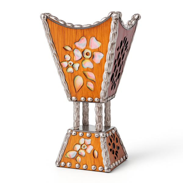 Add a touch of artistry to your space with this beautifully crafted decorative incense burner, designed to blend style and serenity. Featuring a unique hourglass silhouette, this piece showcases floral cutout panels accented with metallic embellishments and intricate detailing. The shimmering inlays and sculpted framework create a refined, eye-catching look that complements any interior.